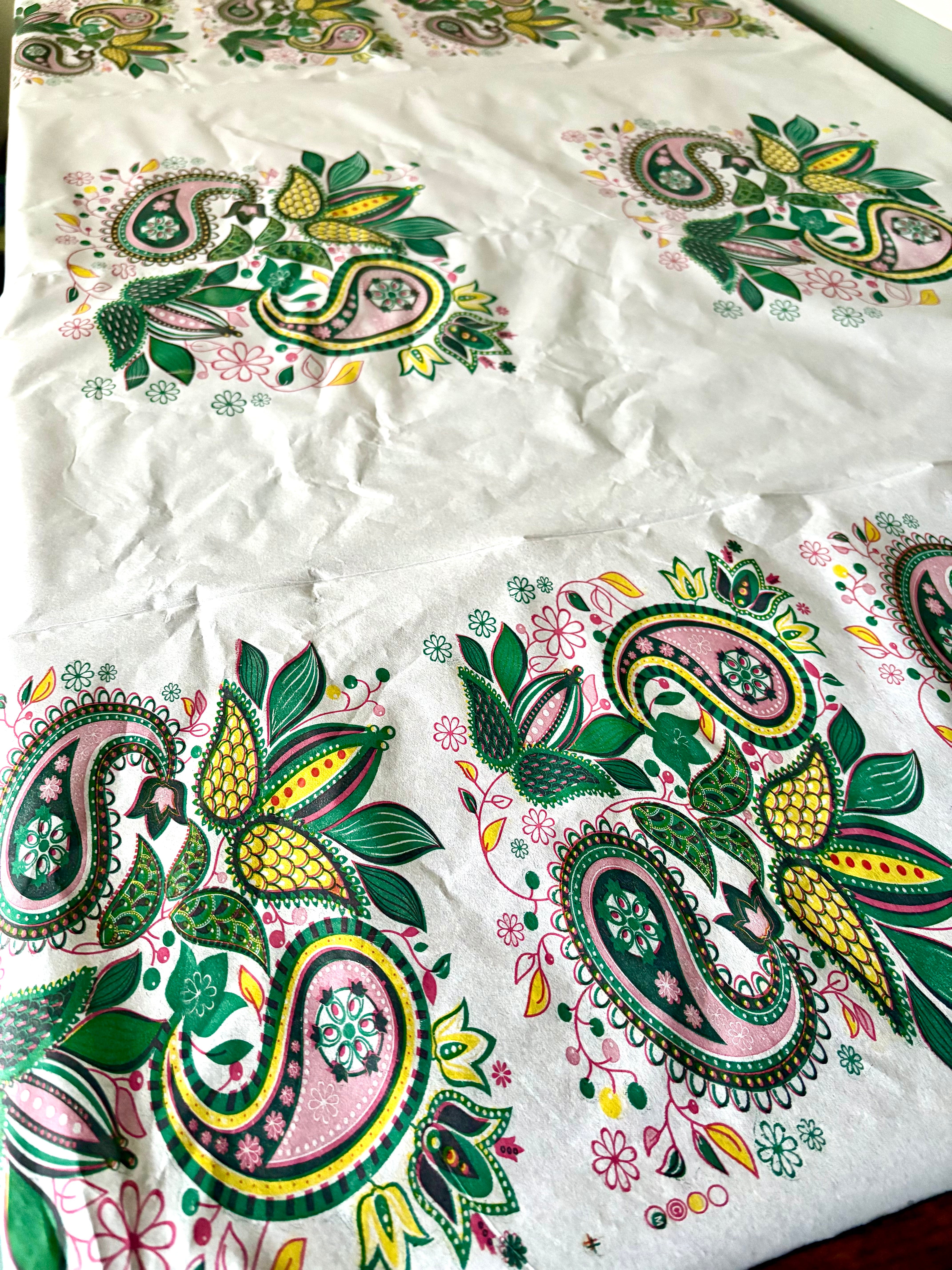 例えば、油ハネする鉄板焼き、水洗いしたばかりの梅仕事、枝付き枝豆の処理、鉢植えの土の入替、ヘアカットの際、などなど。屋外でのピクニックやお花見にもいいですね。ラッピングに使う方もいらっしゃいます。